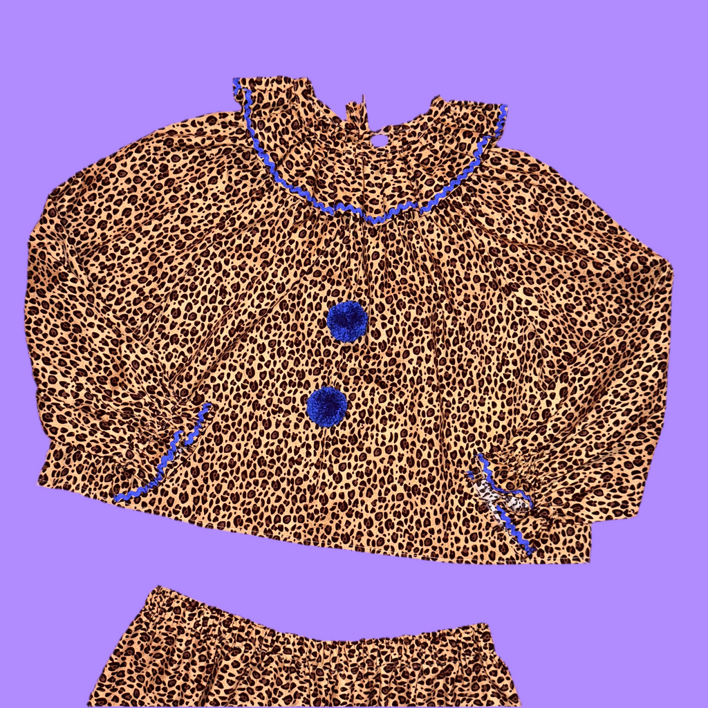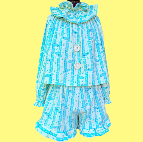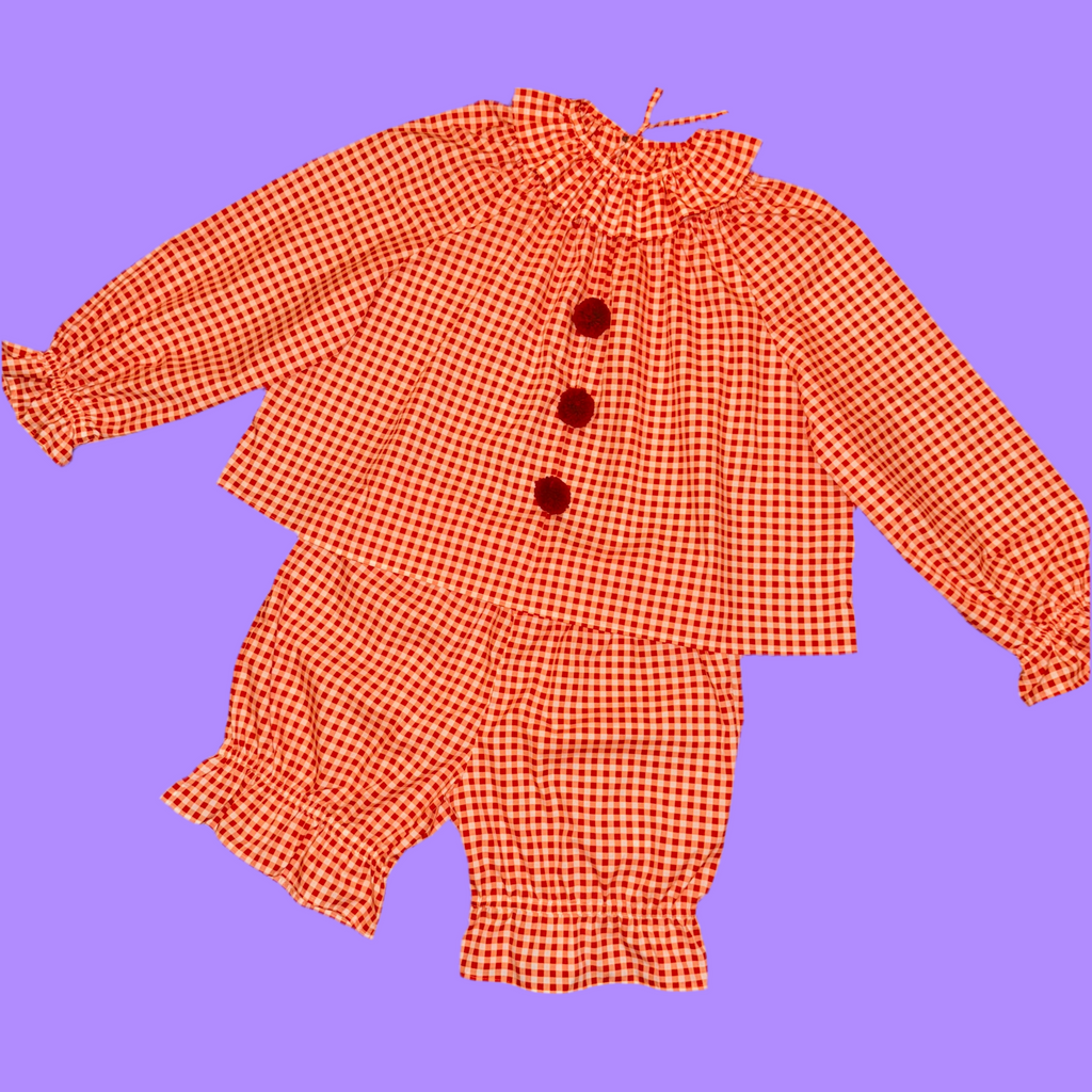 You can send in your own fabric or choose from the 50+ fabrics I have available. You have the option of bloomers, shorts, or pants for the bottoms. Please input your bust, waist, and inseam measurements.